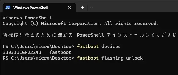必要に応じて、ブートローダーのアンロックコマンドを実行します。