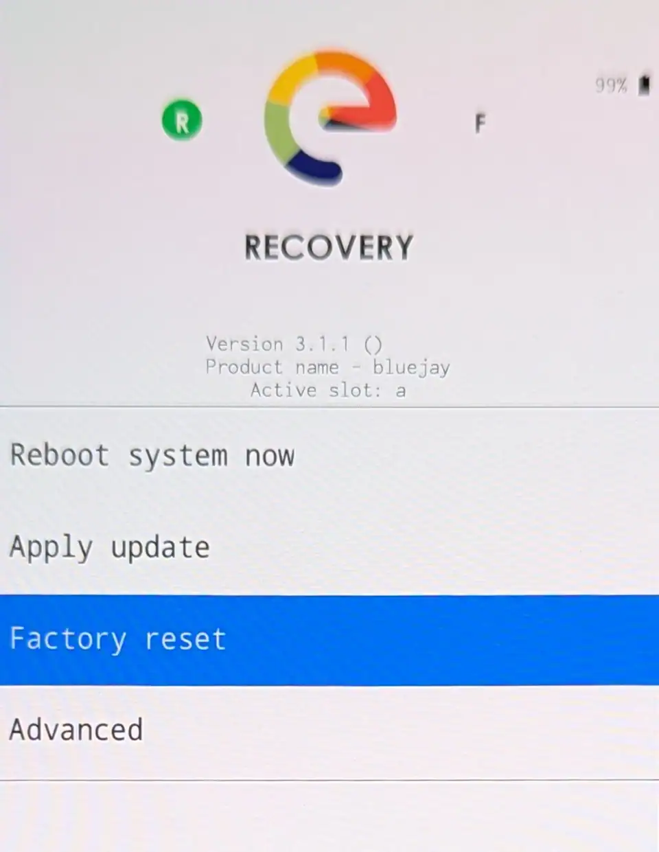 /e/OSのリカバリモードが開いたら、[Factory reset]を選択して電源ボタンで確定します。