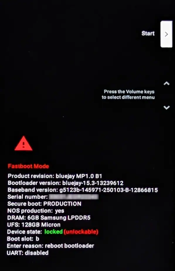 ブートローダーがアンロックされたら、[Start]を選択した状態で電源ボタンを押します。