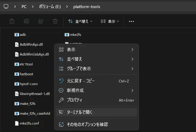 環境変数に platform-toolsのパスを追加していない場合は、platform-toolsフォルダ内でコンテキストメニューからターミナルを開きます。